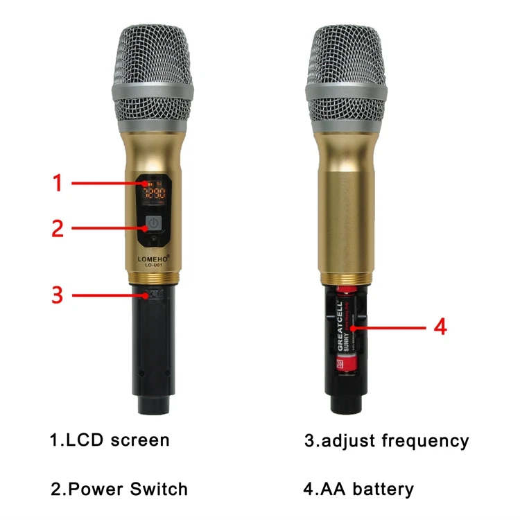3) Frequency button: Press the butto to change the frequency of the handheld microphone. receiver frequency will change automaticly.
