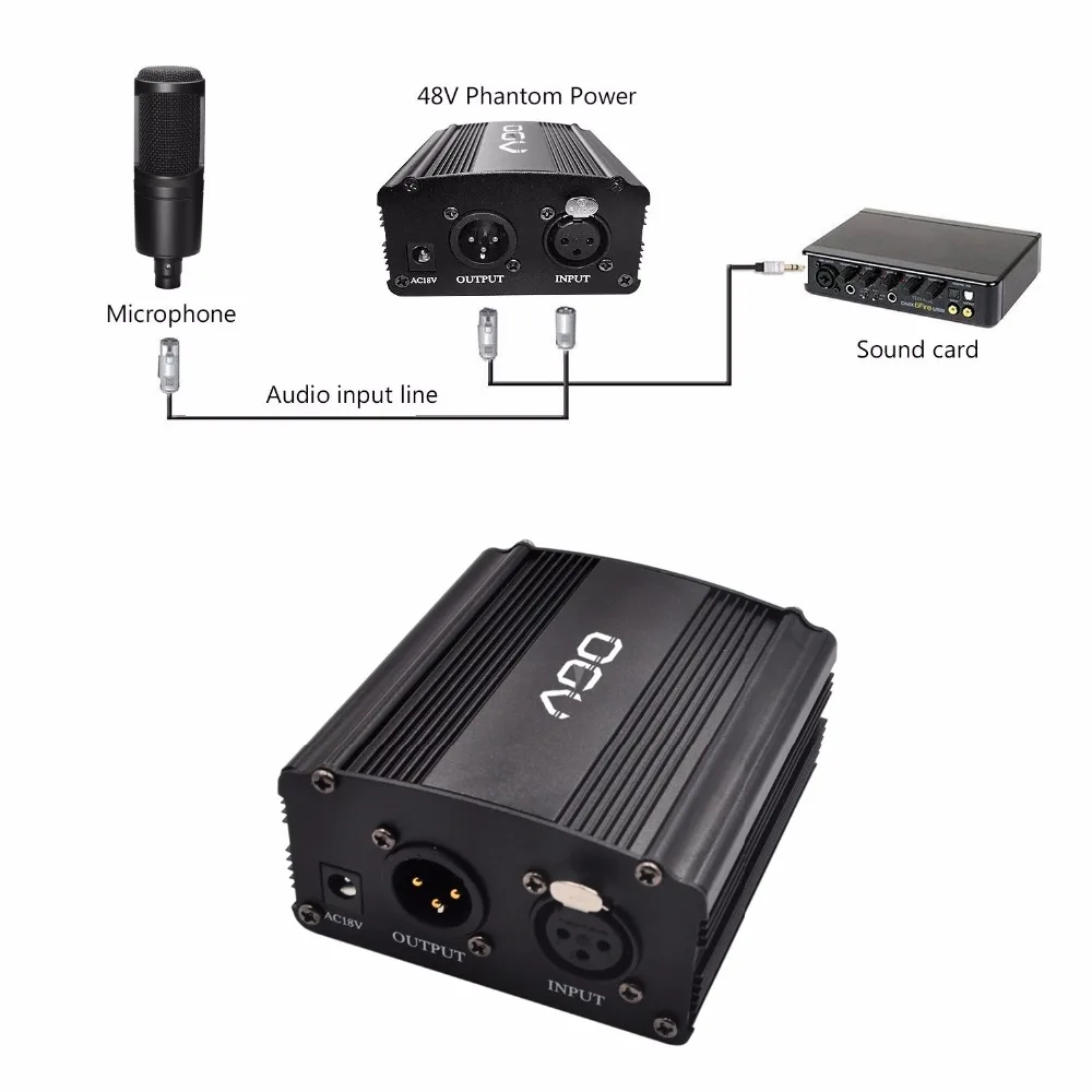48V Phantom Power Supply with Adapter, BONUS+XLR 2M Pin Microphone Cable for Any Condenser Microphone Music Recording Equipment