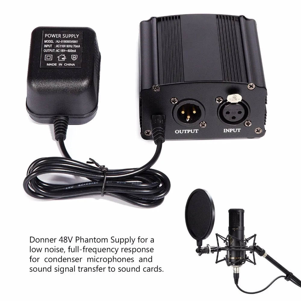 Power up with the Donner 48V Phantom Supply for a low noise, full-frequency response for condenser microphones and sound signal transfer to sound cards, durable, all-metal housing. High-quality components and rugged construction will ensure this power supply with stand up to the test and perform on all occasions. Comes with one XLR audio cable with high quality XLR male and female connectors. On/off power switch and LED indicator.The power supply is built for easy portability and with stylish design at an affordable price. Simple plug in, turn the device on and you’re ready to go.