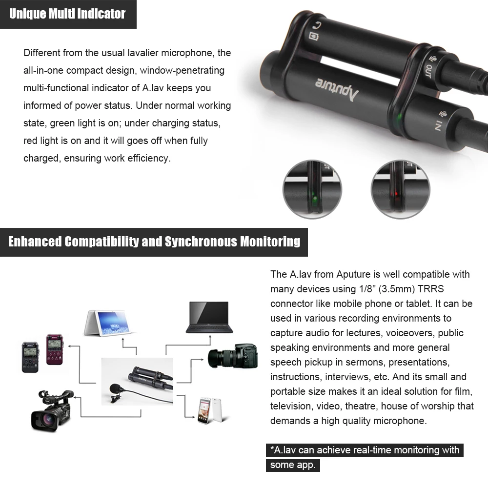 The A.lav from Aputure is well compatible with many devices using 1/8″ (3.5mm) TRRS connector like mobile phone or tablet. It can be used in various recording