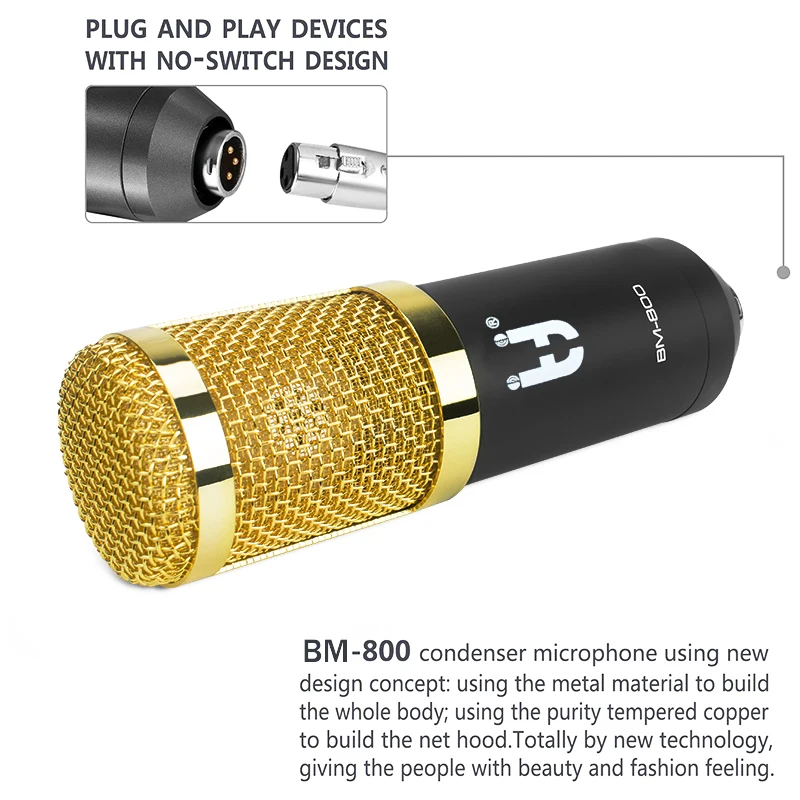 • The Set Includes: 1 X Professional BM-800 Condenser Microphone + 1 X Metal Microphone Shock Mount + 1 X Ball-type Anti-wind Foam Cap + 1 X Microphone Power Cable + 1 X Manual +1 X Scissor Arm Holder + 1 X POP Filter +1 X 48V DC Phantom Power Supply + 1 X 3.5mm Male to XLR Female Cable.