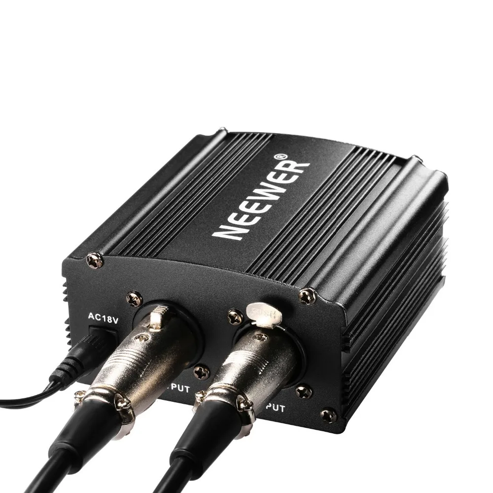 Neewer 48V Phantom Power Supply delivers reliable 48V phantom power for condenser microphones in a compact, durable, plastic housing.